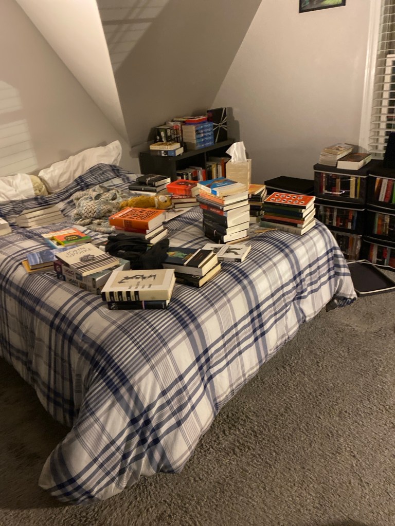 …the horror.” By 9 o’clock, I had gotten a new piling system and moved the books off the bed.
