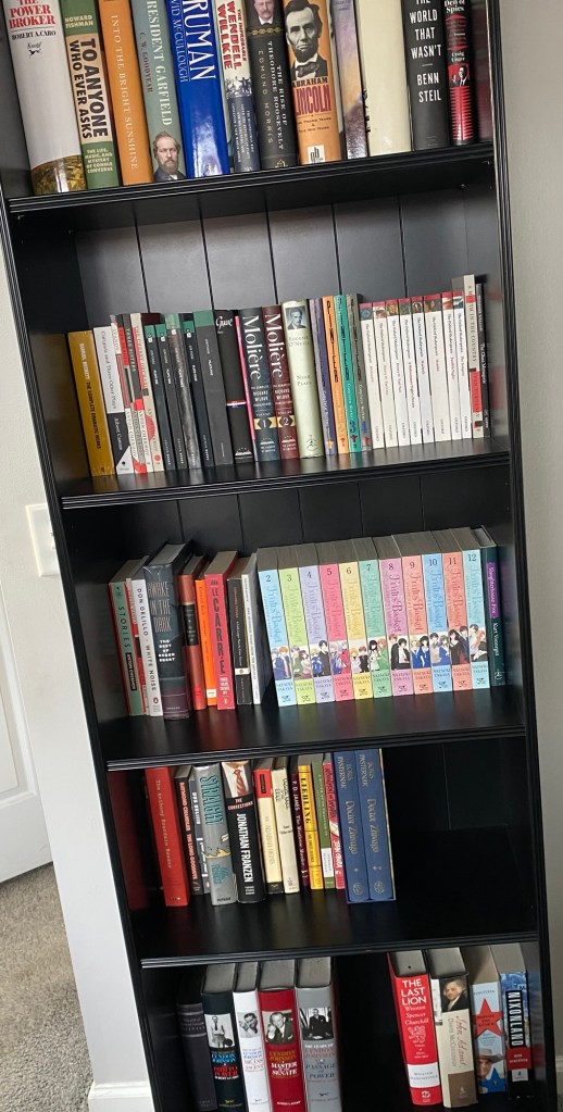 Figure 4 From the top down we have Biography (with the poems of James Schuyler serving as a placeholder), drama, the books of my life (more on this later), short term TBR shelf (for anything I want to read in the coming month), and history/biography, which is still under construction.